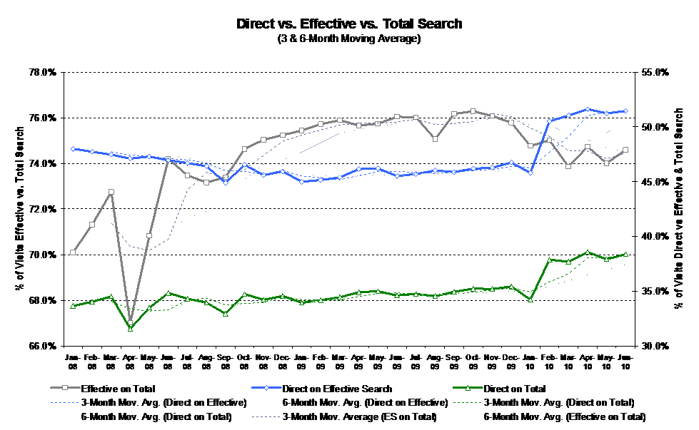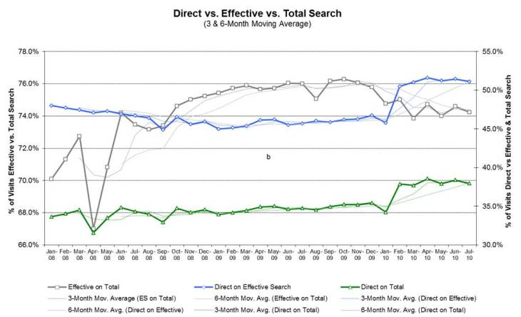 This is how you can build this metrics: 1) Direct Search: all paths made by users that are using your site with the sole intention of conduction a search, being the HP their entry point and the Search page their subsequent exit page; 2) Effective Search: all paths ending successfully with a click over either an organic or sponsored link published on the Search Page; 3) Total Search: all paths that include a visit over a Search Page but that do not necessary end with an exit.