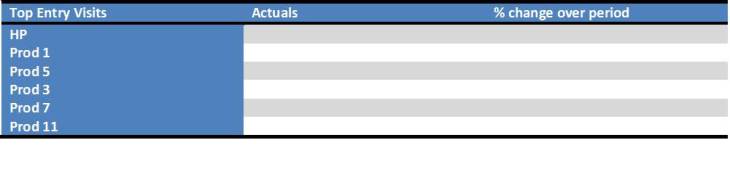 Looking at the top prod per %change w-on-w on entry visits; were there a specific/page section that attracted your visitors? Can you explain the reason? How many users did leave the site after viewing just one content area (bounce rate)? How many go through the first step and went deep into your site?
