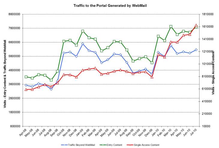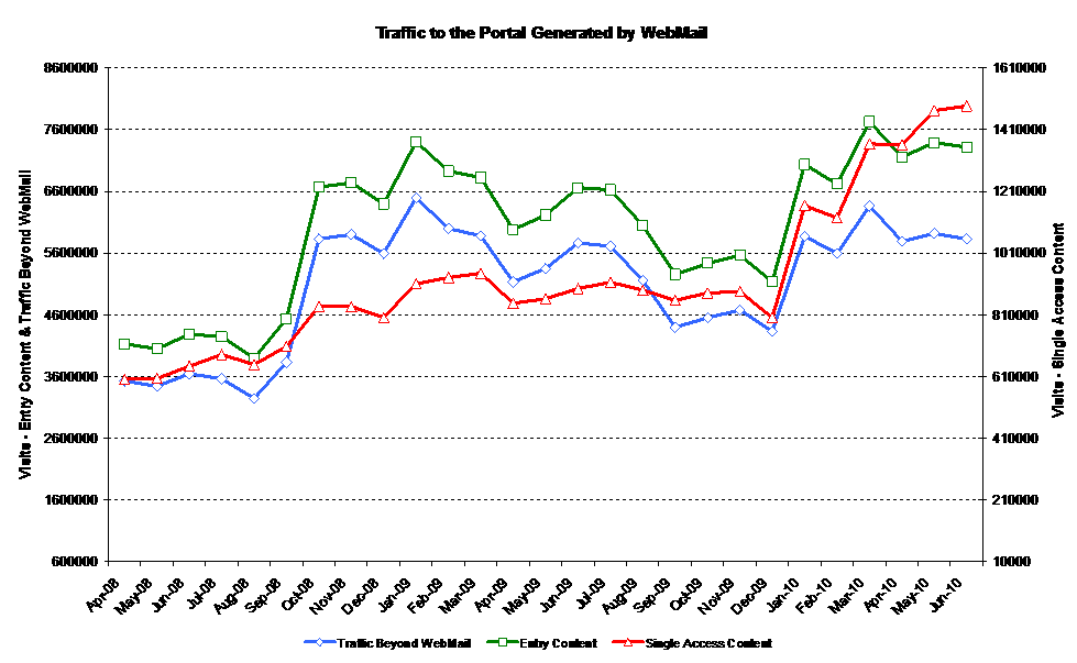 This is how you can build up those KPIs: 1) Entry Content: visits from everyone accessing your site via the Webmail (as entry content); 2) Single Access Content: a restriction from the above definition – we are taking into account solely those interest in checking their email, and thus not generating any page views passed the webmail; 3) Traffic Beyond Webmail: all visits of those accessing the site via Webmail who are also generating page views beyond it.