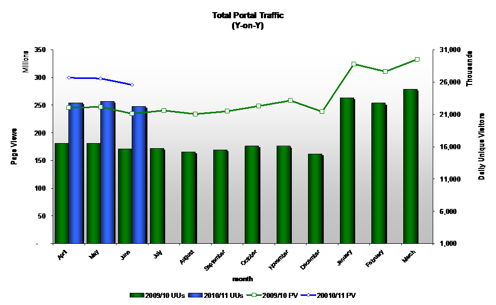 Questions you need to ask yourself are: 1) are we following a similar path y-on-y? (You need to compare the slope of the 2 trending lines and check whether the newest is narrower or deeper than the oldest). 2) If there is a change, was this an event related (e.g. a big promotion, or World Championship tournament), system related (e.g. connection issues, crash, loss of data), or brand related? 3) How are we compared to competitors/industry benchmark? comScore, Hitwise and Nielsen NetRating might help you comparing your company’s stats with competitors.